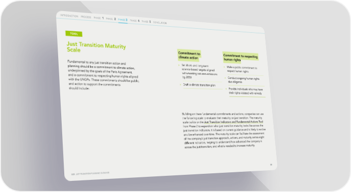 INTRODUCTION PROCESS PHASE 1 PHASE 2 PHASEPHASE 3 3 PHASE 4 PHASE 5 CONCLUSION TOOL Just Transition Maturity Commitment to Commitment to respecting Scale climate action human rights Fundamental to any just transition action and » Set short- and long-term » Make a public commitment to planning should be a commitment to climate action, science-based targets aligned respect human rights underpinned by the goals of the Paris Agreement, with meeting net-zero emissions and a commitment to respecting human rights aligned by 2050 » Conduct ongoing human rights with the UNGPs. These commitments should be public, due diligence and action to support the commitments » Draft a climate transition plan should include: » Provide individuals who may have their rights violated with remedy Building on these fundamental commitments and actions, companies can use the following scale to evaluate their maturity on just transition. The maturity scale builds on the Just Transition Indicators and Fundamental Actions Tool from Phase 2 to expand on what just transition maturity looks like across the just transition indicators. It is based on current guidance and is likely to evolve and be enhanced over time. The maturity scale can facilitate the assessment of the company’s just transition approach, actions, and maturity across eight different indicators, helping to understand how advanced the company is across the just transition, and what is needed to increase maturity. BSR JUST TRANSITION PLANNING GUIDANCE 34