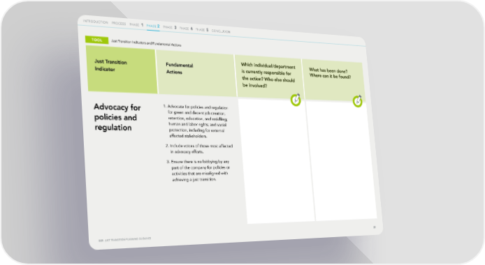 INTRODUCTION PROCESS PHASE 1 PHASEPHASE 2 2 PHASE 3 PHASE 4 PHASE 5 CONCLUSION Just Transition Indicators and Fundamental Actions TOOL Just Transition Fundamental Which individual/department What has been done? Indicator Actions is currently responsible for Where can it be found? the action? Who else should be involved? Advocacy for 1. Advocate for policies and regulation for green and decent job creation; policies and retention, education, and reskilling; regulation human and labor rights; and social protection, including for external affected stakeholders. 2. Include voices of those most affected in advocacy efforts. 3. Ensure there is no lobbying by any part of the company for policies or activities that are misaligned with achieving a just transition. BSR JUST TRANSITION PLANNING GUIDANCE 31