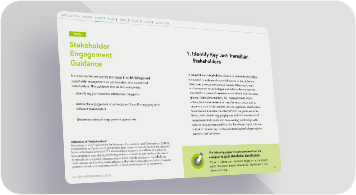 INTRODUCTION PROCESS PHASEPHASE 1 1 PHASE 2 PHASE 3 PHASE 4 PHASE 5 CONCLUSION TOOL Stakeholder 1. Identify Key Just Transition Engagement Stakeholders Guidance A thoughtful and detailed identi昀椀cation of affected stakeholders It is essential for companies to engage in social dialogue and is essential to understanding the full picture of the global just stakeholder engagement on just transition with a variety of transition context as well as local impacts. Meaningful, open, stakeholders. This guidance aims to help companies: and transparent social dialogue and stakeholder engagement » Identify key just transition stakeholder categories ensures the inclusion of impacted, marginalized, and vulnerable groups. Outreach to workers, their representatives and/or unions, local communities that might be impacted, as well as » De昀椀ne the engagement objective(s) and focus for engaging with governments is fundamental to identifying relevant stakeholders. different stakeholders Stakeholders should be identi昀椀ed at both the global and local » Determine relevant engagement approaches levels, particularly in key geographies, with the involvement of departments/individuals who have existing relationships with stakeholders and responsibilities for the relevant topics. It is also critical to consider key business relationships including suppliers, partners, and customers. De昀椀nition of “Stakeholders” According to the Organisation for Economic Co-operation and Development (OECD), stakeholders are “persons or groups who have interests that are or could be impacted 18 A stakeholder is someone who a昀昀ects or is a昀昀ected by an enterprise’s activities.” by a company’s operations, activities, products, or services, and can be either inside The following pages include questions that are or outside the company. Common stakeholders include employees, rightsholders, trade unions, civil society organizations, policymakers, regulators, suppliers, business examples to guide stakeholder identi昀椀cation. partners, investors, consumers, and the communities impacted by operations. Phase 1: Gather your team and engage in a transparent social discussion around stakeholder identi昀椀cation and BSR JUST TRANSITION PLANNING GUIDANCE future planning. 12