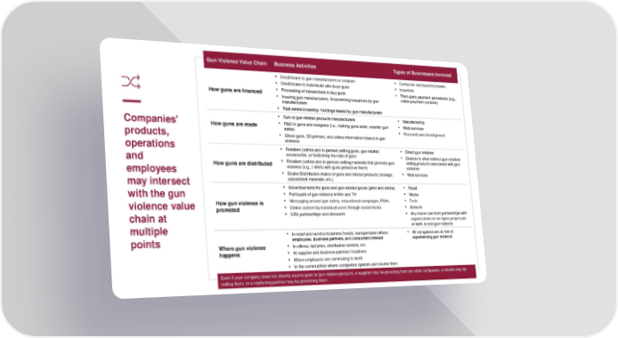 Gun Violence Value Chain Business Activities Types of Businesses Involved • Credit/loans to gun manufacturers or retailers • Consumer and business banks • Credit/loans to individuals who buys guns • Investors How guns are financed • Processing of transactions to buy guns • Third-party payment processors (e.g., • Insuring gun manufacturers; Underwriting issuances by gun online payment systems) manufacturers • Real estate investing / holdings leased by gun manufacturers • Gun or gun-related products manufacturers • Manufacturing Companies’ How guns are made • R&D in guns and weapons (i.e., making guns safer, smarter gun • Web services safes) • Research and development products, • Ghost guns, 3D printers, and online information related to gun operations violence • Retailers (online and in-person) selling guns, gun-related • Direct gun retailers and accessories, or facilitating the sale of guns • Dealers & other indirect gun retailers How guns are distributed • Retailers (online and in-person) selling materials that promote gun selling products associated with gun employees violence (e.g., t-shirts with guns printed on them) violence • Dealer/Distribution chains of guns and related products (storage, • Web services may intersect educational materials, etc.) • Advertisements for guns and gun-related goods (print and online) • Retail with the gun • Portrayals of gun violence in film and TV • Media violence value How gun violence is • Messaging around gun safety, educational campaigns, PSAs • Tech promoted • Online content by individual users through social media • Schools chain at • NRA partnerships and discounts • Any sector can form partnerships with organizations or on topics perpetuate multiple or work to end gun violence • In retail and service locations, hotels, transportation where • All companies are at risk of points employees, business partners, and consumers interact experiencing gun violence Where gun violence • In offices, factories, distribution centers, etc. happens • At supplier and business partners’ locations • When employees are commuting to work • In the communities where companies operate and source from Even if your company does not directly source guns or gun-related products, a supplier may be providing them for other companies, a retailer may be selling them, or a marketing partner may be promoting them.