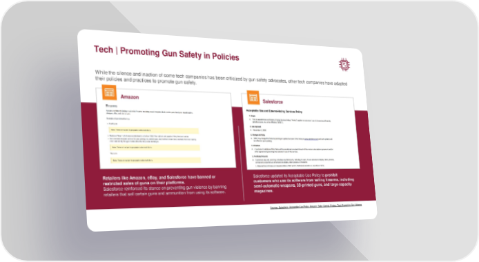 Tech | Promoting Gun Safety in Policies While the silence and inaction of some tech companies has been criticized by gun safety advocates, other tech companies have adapted their policies and practices to promote gun safety. Amazon Salesforce Acceptable Use and External-facing Services Policy Retailers like Amazon, eBay, and Salesforce have banned or Salesforce updated its Acceptable Use Policy to prohibit restricted sales of guns on their platforms. customers who use its software from selling firearms, including Salesforce reinforced its stance on preventing gun violence by banning semi-automatic weapons, 3D-printed guns, and large-capacity retailers that sell certain guns and ammunition from using its software. magazines. Sources: Salesforce: Acceptable Use Policy; Amazon: Seller Central; Forbes: Tech Preventing Gun Violence