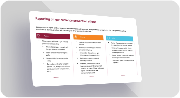 Reporting on gun violence prevention efforts Companies can report on their progress towards implementing gun violence prevention efforts in their risk management reporting, sustainability reports, or along with reporting on other community initiatives. Policy Efforts KPIs • The company publishes a gun violence • Implementing gun violence prevention • Number of suppliers that have committed prevention policy stating: policies to a value chain free from gun violence • Where the company interacts with • Investing in community gun violence • Number of intersection points with the the gun violence value chain prevention initiatives gun violence value chain (i.e., products, • Steps towards implementing the • Sensitization of suppliers on gun partnerships, services) policy violence prevention opportunities • Amount invested in community programs • Responsibility for overseeing the • Participation in local or national towards gun violence prevention policy advocacy initiatives • Number and type of advocacy initiatives • Connections with other company • Reporting can also be included in supported policies (i.e., workplace health and business-as-usual risk management safety, community empowerment, reporting, as many of these actions are etc.) aligned with established risk management practices
