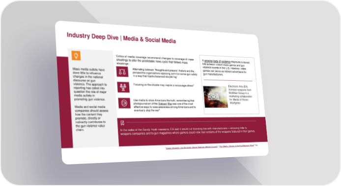 Industry Deep Dive | Media & Social Media Critics of media coverage recommend changes to coverage of mass A growing body of evidence disproves a causal shootings to alter the predictable news cycle that follows mass link between violent video games and gun shootings : violence events in the U.S. However, video games can serve as indirect advertisers for Mass media outlets have Alternating between “thoughts and prayers” rhetoric and the gun manufacturers. done little to influence perspective organizations opposing common sense gun safety in a way that hijacks balanced storytelling1 changes in the national discourse on gun violence. The approach to Focusing on the shooter may inspire or encourage others2 Electronic Arts (EA) reporting has called into licensed weapons from question the role of major McMillan Group in a media outlets in marketing collaboration promoting gun violence. Use media to show Americans the truth, remembering that for Medal of Honor: photojournalism of the Vietnam Warwas one of the most Warfighter. Media and social media effective ways to raise awareness among Americans and to companies should assess eventually stop the war3 how the content they promote, directly or indirectly contributes to the gun violence value chain. In the wake of the Sandy Hook massacre, EA said it would cut licensing ties with manufacturers – removing links to weapons companies and to gun magazines where gamers could view real versions of the weapons featured in their games. 1 2 3 Deakin University: Can the media change American attitudes to guns?; The Atlantic: Changes to the Post Massacre Ritual; ibid.