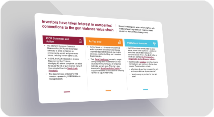 Investors have taken interest in companies' Several investors and organizations working with connections to the gun violence value chain investors have integrated gun violence related issues into their portfolio management. ICCR Statement and As You Sow Institutional Investors Action • The Interfaith Center on Corporate • As You Sow is a U.S.-based non-profit that • CalSTRS and State Street Global Advisors, Responsibility (ICCR) use shareholder works to promote environmental and social among others, came together in a coalition of advocacy to press companies on corporate responsibility through shareholder institutional and private investors with environmental, social, and governance advocacy, coalition building, and innovative combined assets of more than $4.83 trillion to issues, including human rights issues. legal strategies. create and promote the Principles for a • In 2018, the ICCR released an Investor • Their Guns Free Funds is made for people Responsible Civilian Firearms Industry. Statement on Gun Violence, looking to align their investments with their • BlackRock asks questions to civilian firearms identifying 13 actions companies can adopt values by moving money out of companies manufacturers and retailers in effort to drive to reduce the risk of gun violence, many of that make and sell guns. They have also change. These questions include: them adapted from the Sandy Hook developed a Guns Free Action Toolkit to • What steps do you take to support the safe Principles. support employees to advocate their company and responsible use of your products? • The statement was endorsed by 142 to move to a guns-free 401(k). • What licensing do you have for your gun investors representing US$634 billion in sales? managed assets.