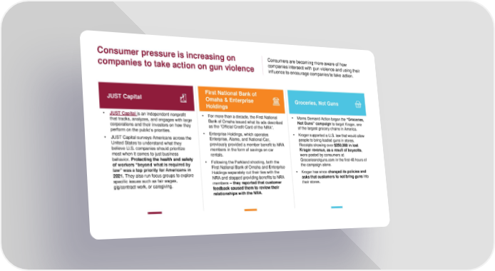 Consumer pressure is increasing on Consumers are becoming more aware of how companies to take action on gun violence companies intersect with gun violence and using their influence to encourage companies to take action. First National Bank of JUST Capital Omaha & Enterprise Groceries, Not Guns Holdings • JUST Capital is an independent nonprofit • For more than a decade, the First National • Moms Demand Action began the “Groceries, that tracks, analyzes, and engages with large Bank of Omaha issued what its ads described Not Guns” campaign to target Kroger, one corporations and their investors on how they as the “Official Credit Card of the NRA”. of the largest grocery chains in America. perform on the public’s priorities. • Enterprise Holdings, which operates • Kroger supported a U.S. law that would allow • JUST Capital surveys Americans across the Enterprise, Alamo, and National Car, people to bring loaded guns in stores. United States to understand what they previously provided a member benefit to NRA Receipts showing over $250,000 in lost believe U.S. companies should prioritize members in the form of savings on car Kroger revenue, as a result of boycotts, most when it comes to just business rentals. were posted by consumers at behavior. Protecting the health and safety • Following the Parkland shooting, both the Groceriesnotguns.com in the first 48 hours of of workers “beyond what is required by First National Bank of Omaha and Enterprise the campaign alone. law” was a top priority for Americans in Holdings separately cut their ties with the • Kroger has since changed its policies and 2021. They also run focus groups to explore NRA and stopped providing benefits to NRA asks that customers to not bring guns into specific issues such as fair wages, members – they reported that customer their stores. gig/contract work, or caregiving. feedback caused them to review their relationships with the NRA.