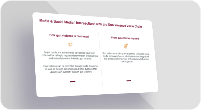 Media & Social Media | Intersections with the Gun Violence Value Chain How gun violence is promoted Where gun violence happens Major media and social media companies have been Gun violence can take place anywhere. Media and social criticized for failing to regulate dissemination of dangerous media companies have a role to play in enacting policies and extremist content linked to gun violence. that protect their employees and customers both online and in-person. Gun violence can be promoted through media discourse as well as through advertising and other avenues that directly and indirectly support gun violence.