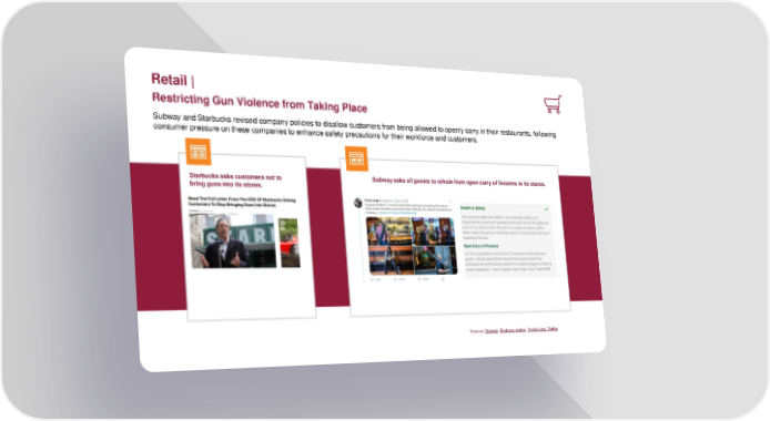 Retail | Restricting Gun Violence from Taking Place Subway and Starbucks revised company policies to disallow customers from being allowed to openly carry in their restaurants, following consumer pressure on these companies to enhance safety precautions for their workforce and customers. Starbucks asks customers not to Subway asks all guests to refrain from open carry of firearms in its stores. bring guns into its stores. Sources: Subway; Business Insider; Travis Long, Twitter