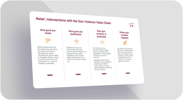 Retail | Intersections with the Gun Violence Value Chain How guns are How guns are How gun Where gun made distributed violence is violence promoted happens Retail companies with their Distributors of guns and Gun violence may be Gun violence can take place own brands may have direct firearms often carry other promoted through images, anywhere, including locations and indirect ties with gun consumer goods. Retailers can words, and themes can be where consumer goods are manufacturers, as gun enhance their gun safety proliferated on t-shirts, games, sold, which makes it vital for manufacturers can be related regulations; and consumer advertising, and other companies to define policies to companies selling a variety goods companies can exert avenues. and protections for their of products aside from guns pressure on retailers to speak Lobbying local and federal workforce and customers and firearms (i.e., parent or out. lawmakers to enact legislation against gun violence. subsidiary companies). promoting gun safety is another way for consumer goods companies to positively use their influence.